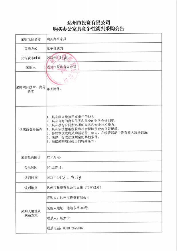 達州市投資有限公司購買辦公家具競爭性談判采購公告